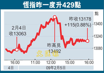 中新網(wǎng)2月6日電 據(jù)香港《文匯報》報道,雖然周三美股跌121點,但港股5日在中資股,特別是中資金融股的推動下,曾升429點,收報13178點,升115點或0.88%,成交額較4日激增近50%至528.32億元,為今年1月中以來最多。