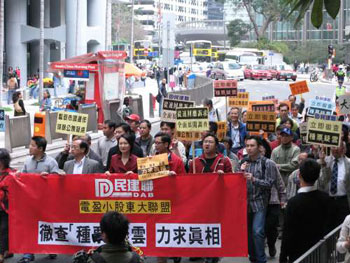 中新網2月9日電 據香港《大公報》報道,香港電盈小股東大聯(lián)盟8日舉行大游行,促請證監(jiān)會盡快徹查電盈懷疑“種票”事件,約百名電盈小股東出席。