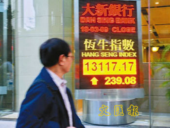 中新網(wǎng)3月19日電 據(jù)香港《文匯報(bào)》報(bào)道,受到外圍金融股造好,港股18日隨美股高開175點(diǎn),匯控連升7天,重上42元,帶動(dòng)恒指重上13000點(diǎn),大市全日升239點(diǎn)或1.86%,收?qǐng)?bào)13117點(diǎn)。國企指數(shù)升124點(diǎn),報(bào)7632點(diǎn)。不過,大市成交縮減至375億元;期指收?qǐng)?bào)13113點(diǎn),升289點(diǎn),比現(xiàn)貨低水4點(diǎn),成交65441張。
