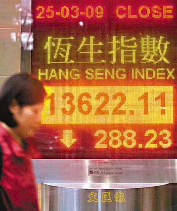 中新網(wǎng)3月26日電 據(jù)香港《文匯報》報道,近日造好的歐美股市周二晚回吐,港股25日跟隨外圍低開156點后,跌幅曾一度收窄,中午收市僅跌73點,但A股午后急“插水”,令港股沽壓再度加劇,臨近收市前更跌逾300點,恒指全日收報13622點,跌288點,成交額542億元。