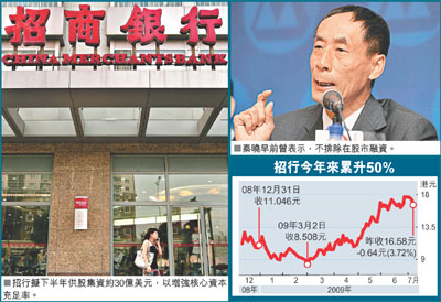 交銀國(guó)際研究部主管楊青麗表示,為提高核心資本充足率,招行只能選擇股本集資的方式,即在二級(jí)市場(chǎng)供股或?qū)Υ蠊蓶|定向增發(fā)。
