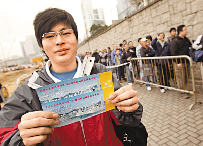 大批市民13日涌往香港兩個(gè)軍營(yíng)外領(lǐng)取入場(chǎng)券,全數(shù)4800張入場(chǎng)券在約3小時(shí)內(nèi)派完。有市民通宵輪候期望借著參觀活動(dòng)了解國(guó)家軍事力量,也有市民打算給子女上一課國(guó)情教育。