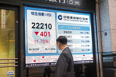 中新網(wǎng)11月27日電 據(jù)香港《文匯報(bào)》報(bào)道,市場擔(dān)心若迪拜世界一旦破產(chǎn),會(huì)令多間主要借款銀行,包括匯控在內(nèi)的歐洲大型銀行需要大額撇帳。亞太區(qū)股市普遍走弱,內(nèi)地及港股也不能幸免,恒指26日曾跌500點(diǎn),尾市跌幅略收窄,但也跌401點(diǎn),收22210點(diǎn),跌幅1.78%,成交773億元。