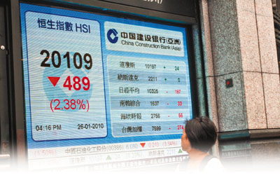 中新網1月27日電 據香港《文匯報》報道,期指結算臨近,港股沽壓持續(xù),恒指連跌5個交易日,累積跌1568點,險守20000點關口。26日適逢多個壞消息出籠,亞太區(qū)股市近全線下挫,港股由開市跌至收市,全無反撲之力,恒指最多跌逾550點,收跌489點或2.4%,跌至20109點,成交777億元。