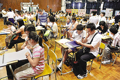 中新網(wǎng)7月8日電 據(jù)香港《文匯報(bào)》報(bào)道,香港今年6.8萬名小六生中,成功獲派首三志愿學(xué)生只有85%,較去年下跌3%,余下過萬名小六生希望落空。升中派位7日發(fā)榜后,即掀起一陣瘋狂叩門潮,不少失意學(xué)生及家長(zhǎng)紛紛把握最后機(jī)會(huì)四出往心儀學(xué)!皳洹睂W(xué)位,多間英中、名牌中中及直資中學(xué)也逼滿心急如焚的人潮。