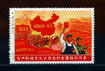 由北京郵票廠印制,面值8分的“全國(guó)山河一片紅”,小幅郵票圖案為工農(nóng)兵手持《毛主席語(yǔ)錄》,背景中“革命委員會(huì)”的紅旗以及工農(nóng)兵群眾熱烈歡呼的場(chǎng)面匯成紅色海洋,畫(huà)面上方為一幅中國(guó)地圖,地圖上除臺(tái)灣省外全部繪成大紅色,并印有“全國(guó)山河一片紅”金字,而大幅的“一片紅”畫(huà)面內(nèi)容與小幅的相似,下書(shū)“無(wú)產(chǎn)階級(jí)文化大革命的全面勝利萬(wàn)歲!”