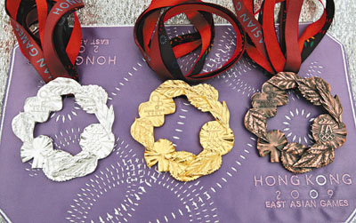 獎(jiǎng)牌的9片花葉分別有香港的洋紫荊、中國的牡丹、日本的櫻花、韓國的木槿、中華臺(tái)北的梅花、澳門的荷花、蒙古的睡蓮、朝鮮的木蘭及關(guān)島的杜鵑。