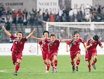 中新網(wǎng)12月11日電 據(jù)香港《明報(bào)》報(bào)道,在特首曾蔭權(quán)及9482名觀眾見證下,香港足球締造歷史,10日晚苦戰(zhàn)120分鐘與朝鮮踢成1﹕1,互射12碼香港男足勝5﹕3,歷來首度在綜合運(yùn)動(dòng)會(huì)晉身決賽,并確保有一面獎(jiǎng)牌,12日下午5時(shí)將在香港大球場上演決賽,與日本爭奪金牌。