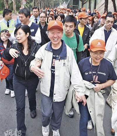 中大14日舉行“與高錕教授同行”籌款日,開步禮除了有高錕伉儷為主角外,中大多名重量級人士,包括校董會主席鄭海泉、兩位前任校長馬臨及金耀基也有參加,現(xiàn)任校長劉遵義也與新婚太太麥嘉軒十指緊扣一同步行。
