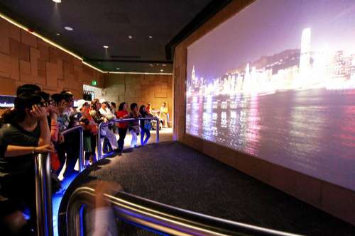 步入展覽廳,觀眾便置身于360度弧形屏幕,觀看一條長2分鐘主題為“香港多面體”的短片,影片藉多元的聲音和視覺效果,帶出不同層次生活的對比,如城市與自然,傳統(tǒng)與現(xiàn)代,中西文化,發(fā)展與保育等。同時,場內有十四個直立LED顯示屏聯(lián)動播放,營造出動感和引人入勝的視覺體驗。觀賞影片時,還可和地面上特制的磚塊互動,互動地磚可感應觀眾的移動,并配合短片的色調,亮起不同的顏色方塊做出回應。