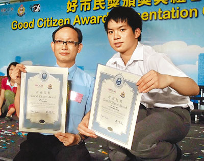 18日共有40名好市民得獎(jiǎng),15歲的容啟聰為最年輕的得獎(jiǎng)?wù)摺1灸?月,他參加運(yùn)動(dòng)會(huì)時(shí)發(fā)現(xiàn)一名可疑男子把一些手袋放到運(yùn)動(dòng)場(chǎng)外的私家車(chē)上,懷疑他偷去同學(xué)的財(cái)物,于是立即通知老師胡文安,并與胡一起追截該男子。該男子其后駕車(chē)逃去,他們立即記下其車(chē)牌號(hào)碼及報(bào)案。