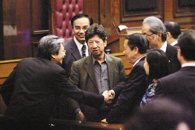 香港金融界的李國寶、專業(yè)會議的梁美芬、商界的黃宜弘、工業(yè)界的林大輝等立法會議員,在特首宣讀施政報(bào)告前,都爭相上前與其握手問好,歷時至少5分鐘,不知期間有否談及其因“小病是福”,民望反而急升的事宜。