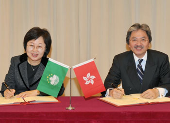 24日,香港財(cái)政司司長(zhǎng)曾俊華及澳門(mén)政法務(wù)司司長(zhǎng)陳麗敏在香港簽署了《中華人民共和國(guó)香港特別行政區(qū)政府與中華人民共和國(guó)澳門(mén)特別行政區(qū)政府關(guān)于持永久性居民身份證入出境及互免填報(bào)入出境申報(bào)表協(xié)議》。這標(biāo)志港澳兩地在出入境事務(wù)方面的合作進(jìn)入新的階段。