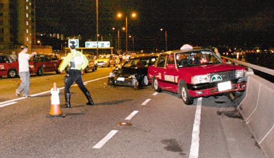 今年7月,警方于觀塘繞道攔截非法賽車時,截停5輛的士、私家車及客貨車等,司機不滿被當作“人肉路障”,部分車輛損毀嚴重,有的維修費高達10萬元,司機向警方投訴要求賠償。