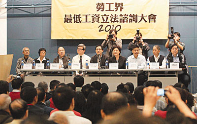 中新網(wǎng)4月27日電 據(jù)香港《文匯報(bào)》報(bào)道,港府正就香港首個(gè)最低工資水平收集各界意見。來(lái)自工聯(lián)會(huì)、勞聯(lián)及職工盟的勞工界昨日號(hào)召逾500人參與“武林大會(huì)”,討論最低工資最新形勢(shì),與會(huì)人士的主流意見傾向?qū)⒆畹凸べY水平訂為時(shí)薪33至35元(港幣 下同),但亦有工會(huì)只要求訂為27元,故仍需待問(wèn)卷調(diào)查完成統(tǒng)計(jì)后,才能定出一個(gè)代表勞工界的最低工資水平,估計(jì)約一星期后有結(jié)果。