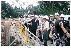 陳麗敏、譚偉文等昨日視察石排灣郊野公園熊貓館建館情況。譚偉文表示,建館工程進度理想,正全力趕工完成基礎(chǔ)土建部分,接著會展開上蓋部分。由于已進入雨季和臺風季節(jié),有關(guān)承建單位已作好防風雨的準備工作,盡量減低天氣對工程的影響。以目前情況來看,相信可爭取九月前完成整項工程。