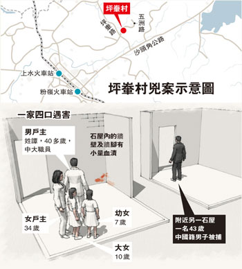 2時許,同事趕到坪輋村譚家時,發(fā)現一名可疑男子在石屋前泥地掘坑有所動作,感覺不妙,于是立即報警。其間疑人發(fā)現行藏敗露,立即跑到附近一間村屋匿藏。警員接報馳至,發(fā)現泥地上有可疑血漬,立即召消防到場協(xié)助,消防員將泥土的表層翻開,見2具男女大人,以及2具女童的尸體,由于4名死者已無生命跡象,警方立即封鎖現場,以待7日進一步挖掘調查。