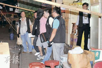 被捕疑兇姓鄺,48歲,23日在油麻地被捕,至晚上9時(shí)許,由50名探員押往油麻地新填地街202號(hào)搜查。探員把多個(gè)水果欄商封鎖搜證,其后檢走一批證物,當(dāng)中包括一柄菜刀,疑犯其后押返警署通宵扣查。至23日晚深夜11時(shí)許,警員再帶走一名工人助查。