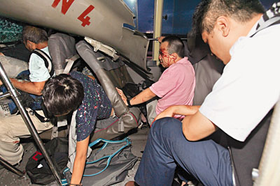 由于沖擊力度猛烈,意外后小巴車頭陷入堅硬貨柜尾,司機首當其沖奄奄一息;車廂內多排座椅椅腳斷開,座位向前傾倒,部分乘客如“三明治”般人疊人受困,其余乘客則被拋離座位撞傷。同時,車頭引擎開始冒出火舌及濃煙,全車人危在旦夕。