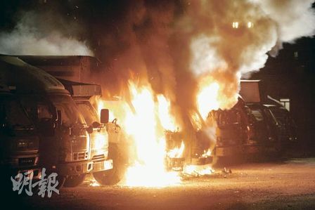 現(xiàn)場(chǎng)為何文田忠孝街56號(hào)的露天停車(chē)場(chǎng),5輛被焚貨車(chē)并排停泊,部分車(chē)輛的駕駛室燒剩支架。其中一輛載有約40罐石油氣的貨車(chē)右車(chē)頭燒毀,幸貨斗內(nèi)的石油氣未被波及,否則后果嚴(yán)重。