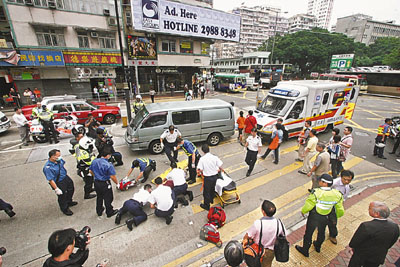 另外,一對來港探親、上了年紀(jì)的內(nèi)地姐弟,昨天上午11時45分在旺角染布房街近亞皆老街交通燈路口橫過南行線馬路時,1輛沿亞皆老街東行客貨車右轉(zhuǎn)入染布房街,弟及時閃避, 68歲陸姓老婦卻被客貨車撞個正著,當(dāng)場飛彈數(shù)呎倒地,頭破血流昏迷,送院情況危殆。肇事客貨車黃姓30歲司機事后在場助查,警方正調(diào)查是否有人不遵照交通燈號導(dǎo)致意外。