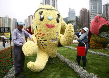 糖街入口處,還有一人多高、由花卉布置成的東亞運(yùn)動會吉祥物“東仔”、“亞妹”,以及6米寬3米高、運(yùn)用金連翹、家樂花、三色堇等構(gòu)成的香港2009東亞運(yùn)動會花墻,供市民拍照。