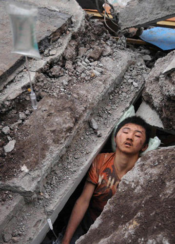 去年5月13日清晨6點(diǎn)多鐘,記者在北川中學(xué)的廢墟上,拍攝下了兩張照片:一個(gè)穿著黃色T恤、半昏迷的男孩,被夾在垮塌的教學(xué)樓預(yù)制板夾縫中,僅露出上半身;他的身邊,一個(gè)穿著藍(lán)色上衣的男孩,正為夾縫中的孩子拎著吊瓶。照片中的兩名男孩,就是后來被人們稱作“吊瓶兄弟”和“夾縫小子”的北川中學(xué)高一學(xué)生李陽和廖波。