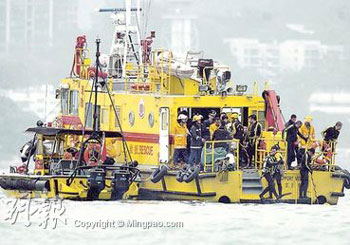 撞船意外后,香港多個(gè)部門(mén)連續(xù)兩晚通宵搜救,10艘水警輪、6艘海事處船舶、5艘消防船和5架飛行服務(wù)隊(duì)直升機(jī)先后參與救援,但一直未有失蹤者音信。消防處表示,23日每次派出一組兩人的蛙人,9度潛入海底搜索,且曾經(jīng)接近船身,以直接敲打方式測(cè)試有否生命跡象,可惜絲毫沒(méi)有反應(yīng),蛙人也未能進(jìn)入船艙。