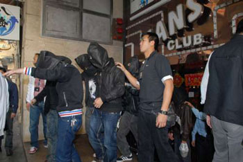 警員進入酒吧后實時控制場面,繼而展開搜查,在店內(nèi)3間貴賓房內(nèi)先后搜出3把用紗布纏著刀柄長近3呎的開山刀及3柄牛肉刀,拘捕40男女,用膠塑帶兩人一組綁著押上警車帶署調(diào)查。
