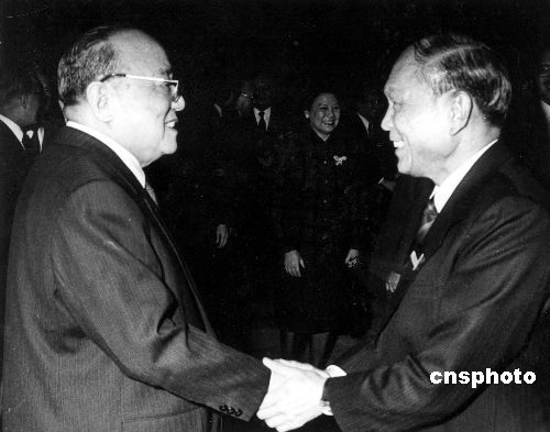 圖為一九九一年一月,時(shí)任中國(guó)國(guó)家主席楊尚昆在北京會(huì)見(jiàn)以霍英東為團(tuán)長(zhǎng)的香港中華總商會(huì)京滬訪問(wèn)團(tuán)。