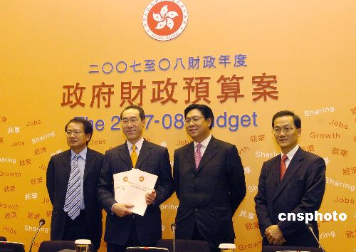 香港財(cái)政司司長(zhǎng)唐英年手持07-08年政府財(cái)政預(yù)算案文本與財(cái)經(jīng)事務(wù)及庫(kù)務(wù)局局長(zhǎng)馬時(shí)亨、財(cái)經(jīng)事務(wù)及庫(kù)務(wù)局常任秘書長(zhǎng)(庫(kù)務(wù))黎年(左一)及政府經(jīng)濟(jì)顧問郭國(guó)全(右一)在政府合署會(huì)議廳會(huì)見記者。中新社發(fā) 鄧慶樂 攝