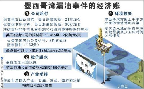瑞士信貸銀行說,英石油清理漏油和應(yīng)對(duì)法律訴訟花費(fèi)將累計(jì)370億美元;高盛公司估計(jì)為330億美元;雷蒙德—詹姆斯合伙公司分析師說,美國(guó)涉及環(huán)境案件的司法制度“更有利原告方”,英石油“賬單”稅后將接近630億美元。