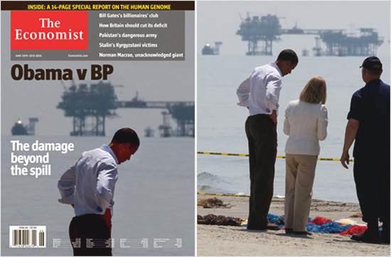 《經(jīng)濟(jì)學(xué)人》的這張封面照讓美國民眾極為憤怒。原來,這張圖片被編輯做了刻意的修改,利用Photoshop去掉了兩個人——站在奧巴馬右側(cè)的拉福什縣縣長夏洛特·蘭道夫(Charlotte Randolph)(中)和美國海岸警衛(wèi)隊(duì)司令薩德·艾倫(Thad Allen)。而這樣做的目的就是營造出“孤獨(dú)”的氣氛。