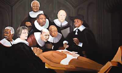 該幅油畫出自當?shù)厮囆g家達馬素,是17世紀著名畫家林布蘭描繪12歲艾滋病斗士恩科西-約翰遜的《杜爾博士的解剖學課》現(xiàn)代版。