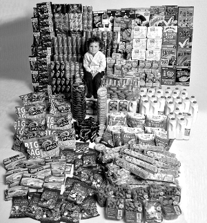 12日,英國媒體刊登了一份英國食品標(biāo)準(zhǔn)機(jī)構(gòu)和營養(yǎng)調(diào)查機(jī)構(gòu)共同統(tǒng)計(jì)的數(shù)據(jù),數(shù)據(jù)統(tǒng)計(jì)了4到10歲兒童平均每人一年內(nèi)所食用的包括蛋糕、冰激凌等在內(nèi)的“垃圾食品”的數(shù)量,并將所有這些放在一起拍了張照片。據(jù)統(tǒng)計(jì)每名兒童一年平均吃5840克餅干、8030克蛋糕、4380克奶酪、5840克冰激凌等。(綜合)