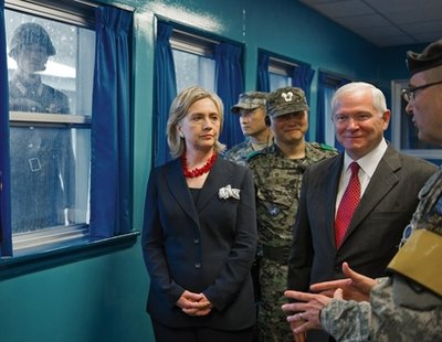 美國媒體報道稱,當希拉里和蓋茨走進軍事停戰(zhàn)委員會樓時,對面一方的朝鮮士兵立即透過窗戶,對兩人怒目而視。