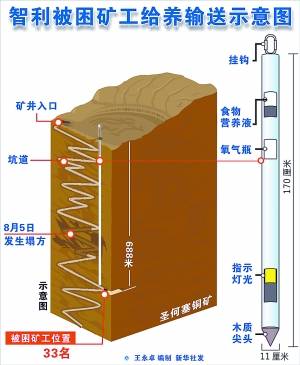 智利圣何塞銅礦本月5日發(fā)生塌方,救援人員22日發(fā)現(xiàn)33名被困礦工的位置,在此之前他們依靠少量食物頑強(qiáng)堅(jiān)持了17天。智利政府目前正全力展開救援工作,然而,技術(shù)上的困難導(dǎo)致可能要花4個(gè)月時(shí)間才能救出全部礦工。當(dāng)局絞盡腦汁激勵(lì)他們的求生意志,運(yùn)送抗抑郁藥物、娛樂(lè)設(shè)施等供其打發(fā)時(shí)間,還指導(dǎo)他們挖廁所預(yù)防疾病、鍛煉身體便于以后逃生等。