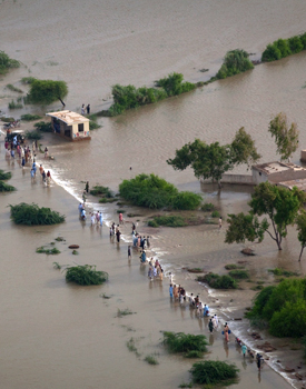 洪水已經(jīng)淹沒(méi)了巴基斯坦三分之一的土地,援助物資依然極為匱乏,工程師們經(jīng)常需要面對(duì)將洪水引向何方的困難抉擇。毀掉堤壩是控制洪水水位最常用的方式之一,謹(jǐn)慎行事可以減小洪災(zāi)的影響?墒,一些報(bào)道稱(chēng),旁遮普省Muzaffargarh地區(qū)的地方官員迫使工程師將洪水引向人口密集區(qū),而避開(kāi)更小、更富裕的地區(qū)。
