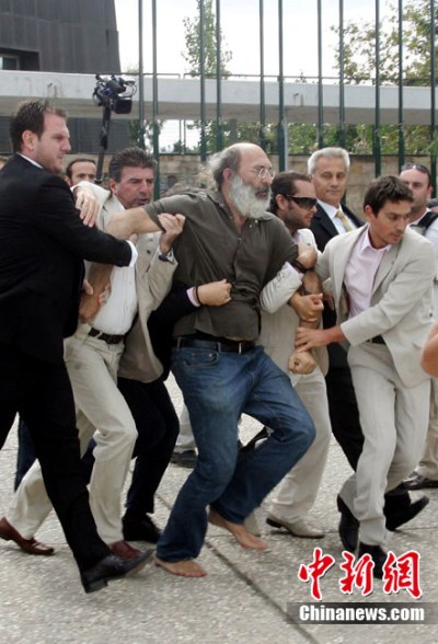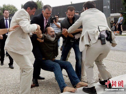 中新網(wǎng)9月12日電 據(jù)臺灣“中廣新聞網(wǎng)”11日報道,一名希臘男子因不滿希臘政府的經濟緊縮政策,對希臘總理帕潘德里歐丟擲鞋子。
