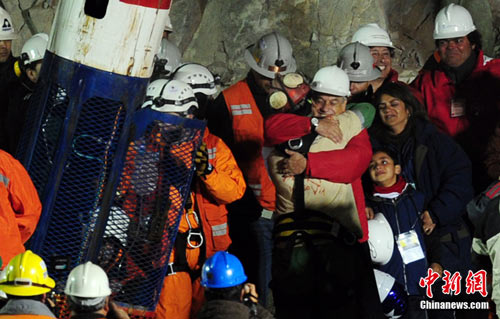 卡洛斯升井后跪倒在地,顯得十分激動(dòng)。之后他與妻女熱烈相擁,礦友們也鼓掌相慶,智利總統(tǒng)皮涅拉上前擁抱送上祝福。玻利維亞總統(tǒng)莫拉萊斯答應(yīng)用總統(tǒng)專(zhuān)機(jī)將卡洛斯載回祖國(guó)。