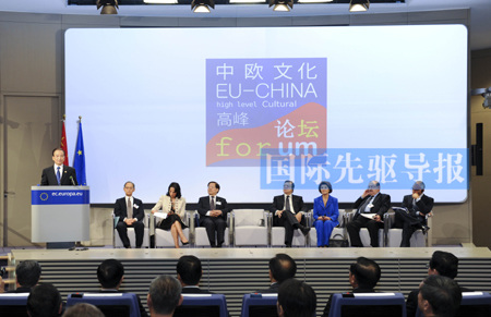 這是10月6日舉行的首屆中歐文化高峰論壇現(xiàn)場(chǎng)。為期兩天的論壇由中國(guó)文化部、歐盟委員會(huì)對(duì)外關(guān)系總司和教育文化總司共同主辦。開幕式當(dāng)天,和歐盟委員會(huì)主席巴羅佐一起出席論壇的中國(guó)總理溫家寶意味深長(zhǎng)地發(fā)表演講說(shuō):“文化交流比政治交流更久遠(yuǎn),比經(jīng)濟(jì)交流更深刻!