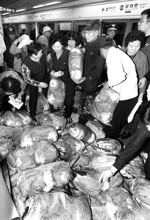 10月15日,首爾城市鐵路公社在地鐵5號(hào)線的光華門站臺(tái)開辦了一個(gè)“5678幸福集市”。集市打著折扣價(jià)的旗號(hào),將3000棵大關(guān)嶺高冷地白菜以每袋(3棵)9800韓元(約合58元人民幣)的價(jià)格出售。