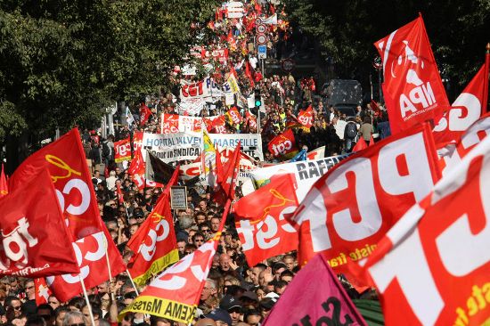 在薩科奇的親自推動下,法國這一輪的退休制度改革搞得如火如荼,總理菲永領(lǐng)導(dǎo)下的內(nèi)閣所提出的改革方案中最重要的內(nèi)容,已經(jīng)在9月份獲得法國國民議會(眾議院)通過,參議院也已經(jīng)在本月8日通過了提高退休年齡的法案,其余部分將在今日進(jìn)行最后表決。法國工會和學(xué)生發(fā)起聲勢浩大的全國性罷工和示威,就是想趕著表決之前,盡最大的努力加以阻止,就像1995年的那次致使全國交通運輸系統(tǒng)癱瘓的大罷工,最終迫使希拉克政府不得不取消了養(yǎng)老金改革。
