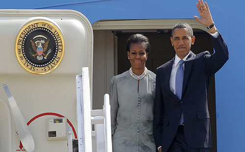 報道稱,奧巴馬乘坐的“空軍一號”專機于當?shù)貢r間中午12時50分左右降落孟買國際機場。美國總統(tǒng)和第一夫人走出機艙向迎接的美印兩國政要招手致意。
