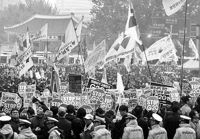 中新網(wǎng)11月8日電 韓國首爾將于本周四、五舉行20國集團(tuán)(G20)峰會,當(dāng)?shù)?日有4萬人在市政廳附近的首爾廣場示威,反對全球化及美韓自由貿(mào)易協(xié)定等,逾8000名防暴警察在場戒備。據(jù)香港《文匯報》報道,數(shù)百名群情洶涌的示威者嘗試游行到市中心,與防暴警察沖突,警方發(fā)射胡椒噴霧阻止人群前進(jìn)。