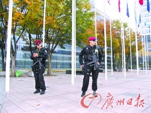 記者一到仁川國(guó)際機(jī)場(chǎng),就能明顯感受到G20的氛圍。從仁川機(jī)場(chǎng)到首爾市區(qū),峰會(huì)的官方會(huì)徽青紗燈籠標(biāo)志到處可見。在G20首爾峰會(huì)的主會(huì)場(chǎng)COEX會(huì)展中心,全副武裝的特警在會(huì)場(chǎng)周圍24小時(shí)巡邏。