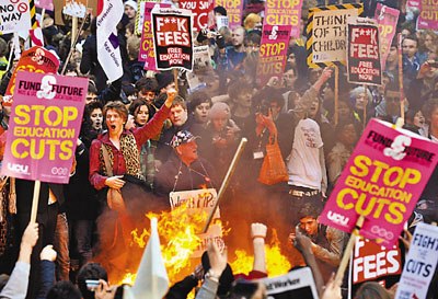 中新網(wǎng)11月12日電 據(jù)香港《文匯報》12日報道,英國10日爆發(fā)首場反對財政緊縮措施的暴力示威,5萬名學生在首都倫敦上街抗議,反對政府削減教育開支,并大幅上調(diào)每年學費至9000英鎊(約合9.6萬元人民幣),是現(xiàn)水平的3倍。后來,示威演變成暴力沖突,部分人沖進保守黨總部大樓,破壞接待處和大堂,有人從天臺投擲雜物。事件中有14人受傷,32人被捕。首相卡梅倫譴責了此次事件,稱不能接受暴力行為。