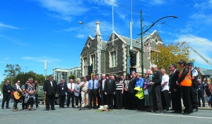 當天12時51分,教堂鐘聲敲響,克賴斯特徹奇城內(nèi)警察、政府官員和居民靜默站立,一些人低下頭,一些人緊抱親友。正在廢墟中搜尋的救援人員也停止工作,低下頭,同全國民眾一起默哀。