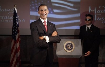 在美國(guó)紐約時(shí)代廣場(chǎng)的蠟像館,奧巴馬的蠟像正式與游客見(jiàn)面。奧巴馬的蠟像穿上深藍(lán)色西裝、配襯藍(lán)色的領(lǐng)帶及美國(guó)國(guó)旗襟章,雙手放在胸前,臉上掛有親切笑容,站在白宮總統(tǒng)辦公室布景中,造形神氣。