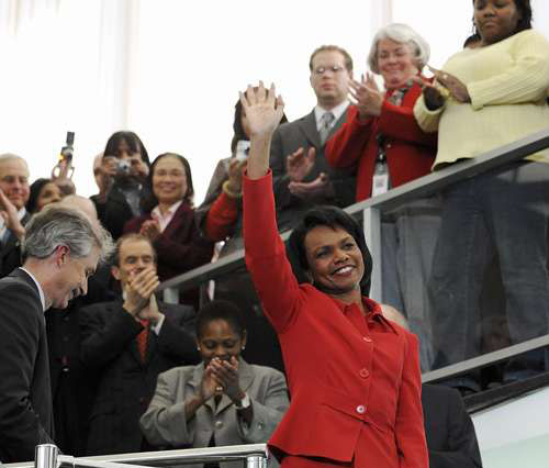 美國國務(wù)院十六日舉行了一場告別會(huì),國務(wù)院全體職員均有出席。會(huì)上國務(wù)卿賴斯發(fā)表了一段主題為保衛(wèi)全球自由民主的重要性的簡短演說。然后,她向下屬們說:“你們永遠(yuǎn)都會(huì)留在我的腦海里、我的禱告里和我的心里。”當(dāng)時(shí)她面露微笑,但眼里泛著淚光,而且說話的聲音哽咽。語畢,臺(tái)下向她報(bào)以熱烈的歡呼和掌聲,她則步下臺(tái)階,與各個(gè)大使、外交官、安全官員等逐一握手并拍照留念,然后步出大門。